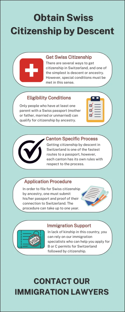Contact us for assistance in navigating the process of acquiring citizenship by descent in Switzerland. Our team of immigration lawyers specializes in guiding individuals through the intricate steps involved in proving Swiss lineage and securing citizenship based on parental nationality. With our assistance, you can streamline the application process and confidently pursue your Swiss citizenship by descent.